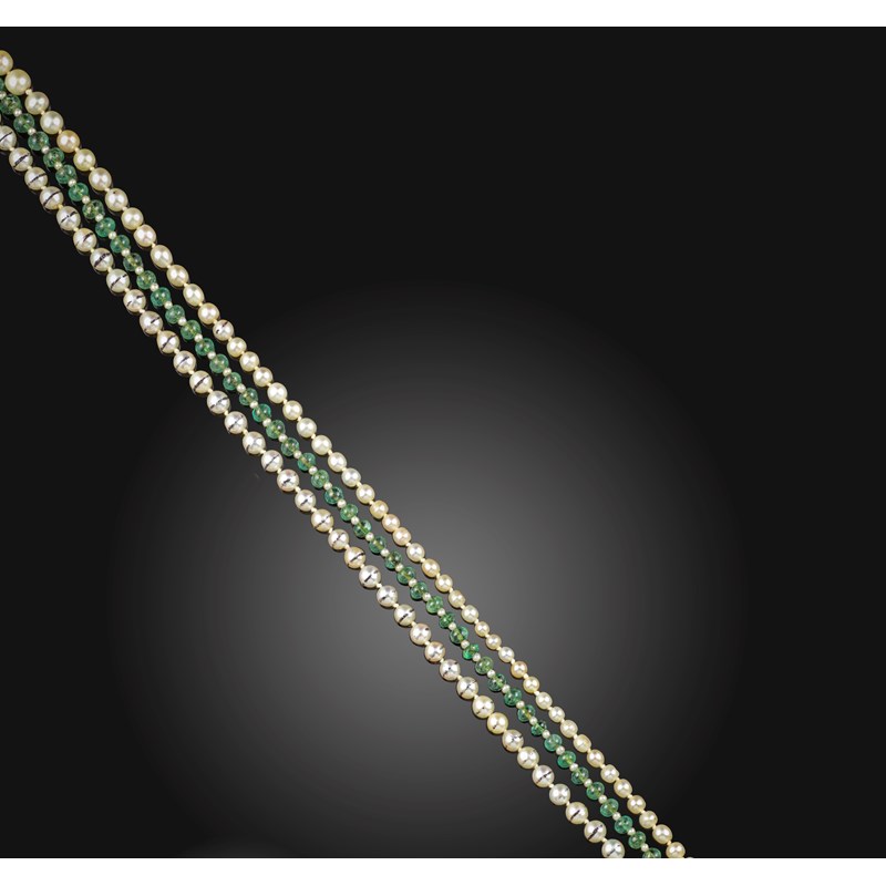A three-row pearl and emerald necklace