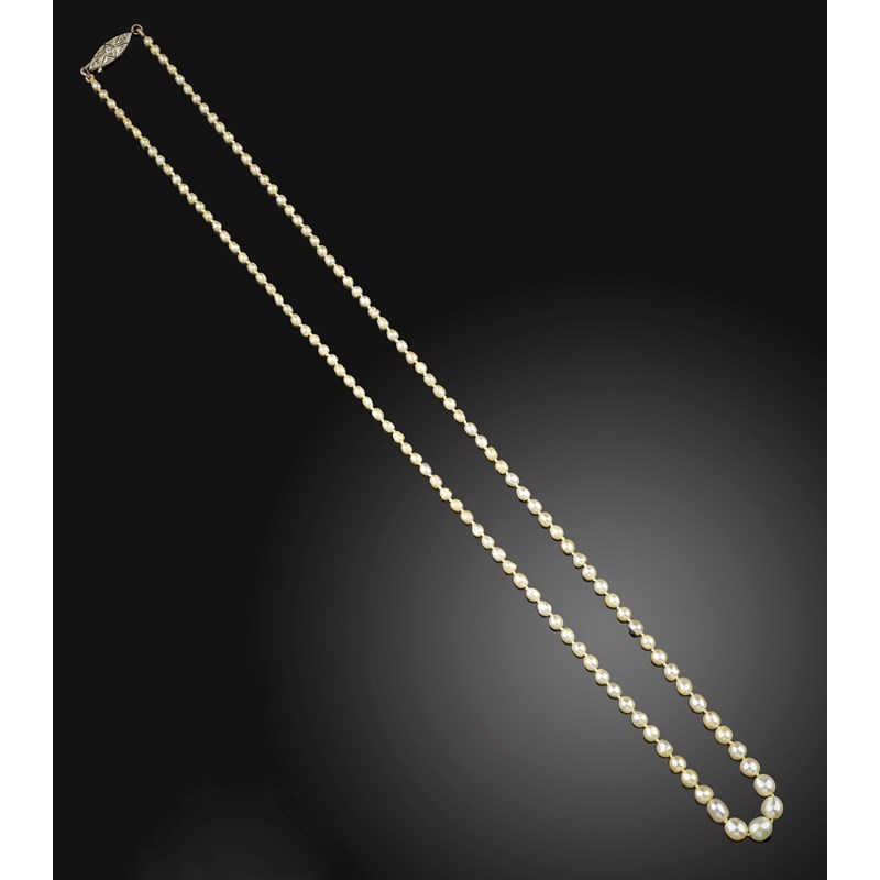 A single-row natural pearl necklace, the pearls graduate from 1.9 - 5.4, with a diamond-set lozenge clasp, 52cm long