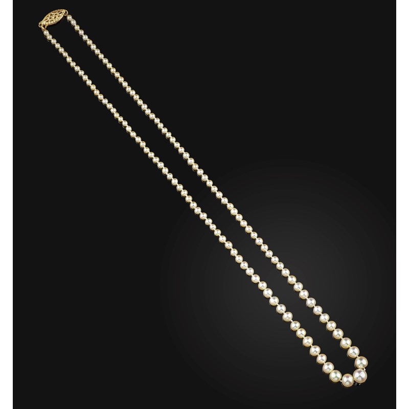 A single row natural pearl necklace, the pearls graduate from 2.3 - 6.5mm with a plain gold clasp, 46cm long
