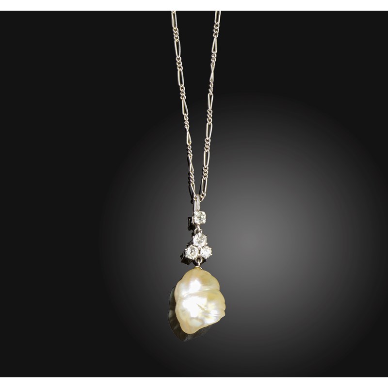 A natural pearl and diamond pendant, the baroque-shaped pearl suspends below a trefoil of circular-cut diamonds in white gold, with a further circular-cut diamond to the suspension loop, on a fine-link white hold neck chain, 3.2cm high, case