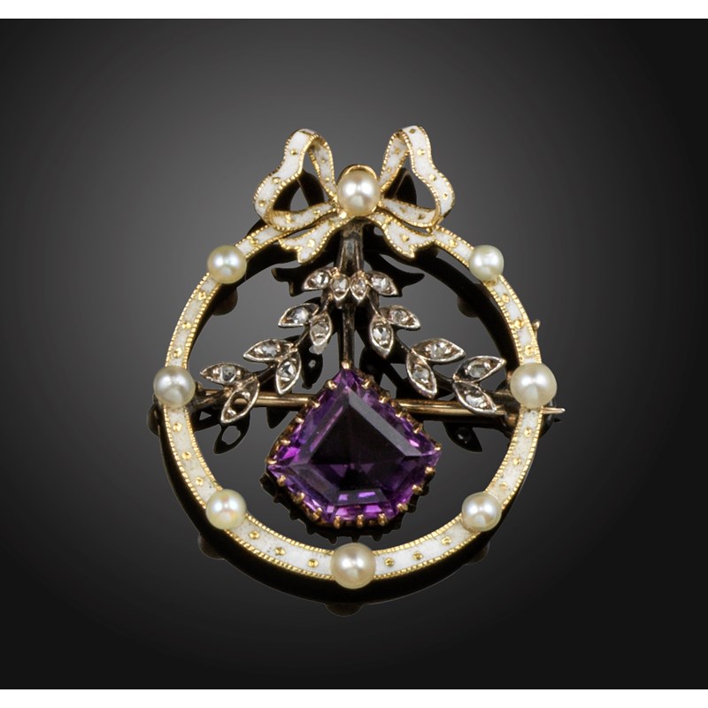 An Edwardian gem-set and enamel gold brooch pendant, with white enamel decoration on gold, set with seed pearls, suspending an amethyst on knife-edge link below a rose-cut diamond-set foliate section in silver on gold (one diamond missing), 3.2cm high, fitted case by Carrington & Co