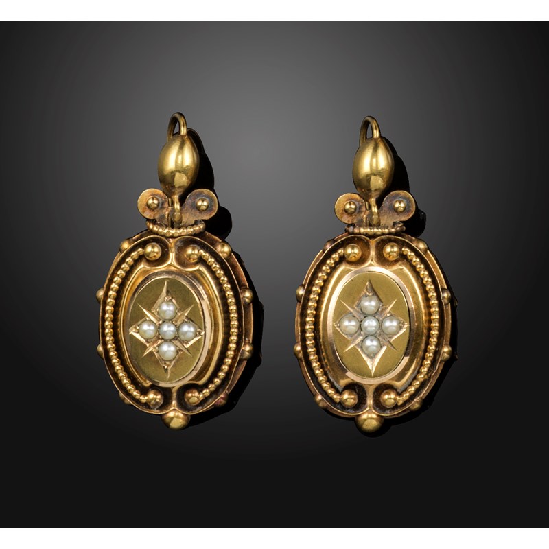 A pair of late Victorian gold earrings, set with seed pearls and with pellet decoration, hook fittings, 3.2cm high