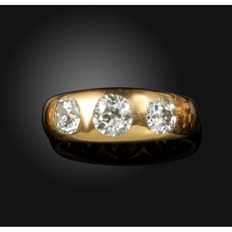 A diamond three stone gypsy ring, set with graduated old cushion-shaped diamonds weighing approximately 2.00cts in total in yellow gold, size V 1/2