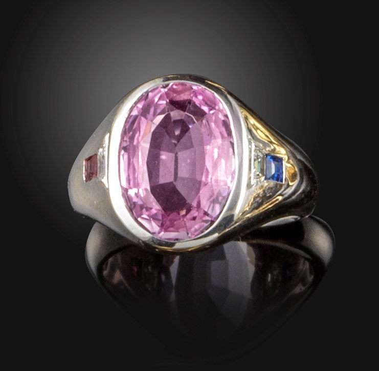 A topaz, sapphire and diamond-set ring, the oval-shaped pink topaz set in platinum with two tapered baguette shaped shoulder diamonds and a further square-shaped sapphire and square-shaped ruby to the shoulders, size J