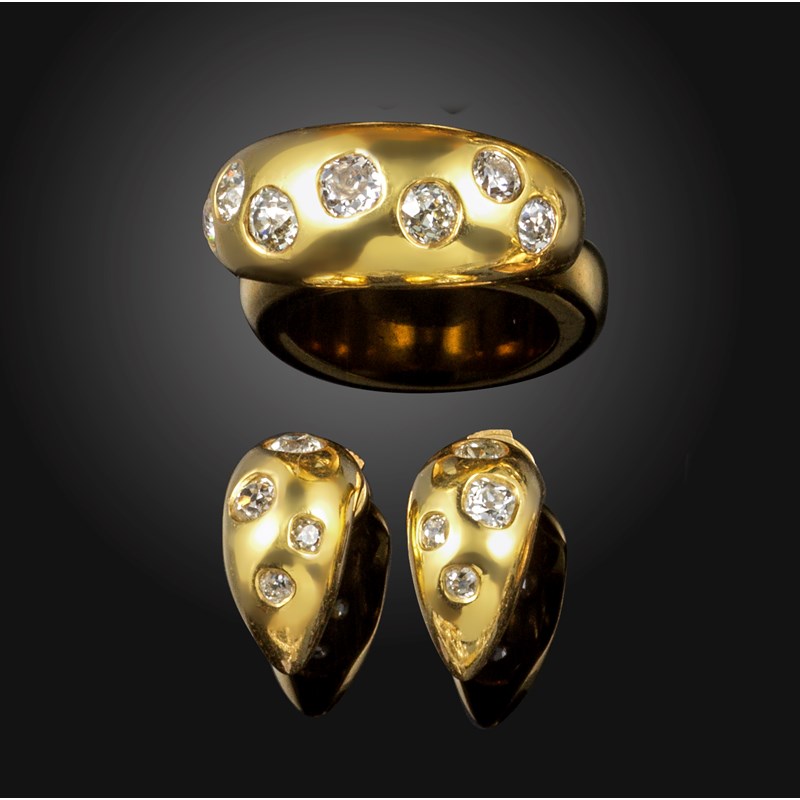 A diamond bombe ring, set with seven graduated old cushion-shaped diamonds in yellow gold, size R 1/2, with a matching pair of diamond-set gold earrings, 1.6cm high