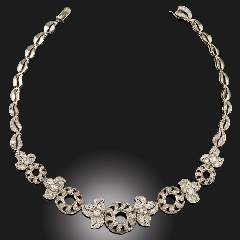 A DIAMOND NECKLACE MOUNT, composed of circular cluster links alternating with foliate motifs all set with old cut diamonds, tapering to plain leaf-shaped fancy linking with a diamond-set clasp, in platinum, French control marks and maker's mark, length 40cm, gross weight 84g