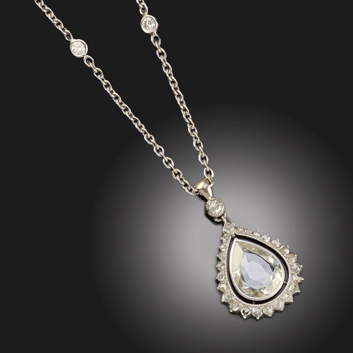 A DIAMOND PENDANT, set with a flat pear-shaped diamond, suspended from a rose-cut diamond-set frame, in platinum, length 2.6cm, to a white gold oval link chain, with spectacle-set round brilliant-cut diamonds, chain length approximately 20cm