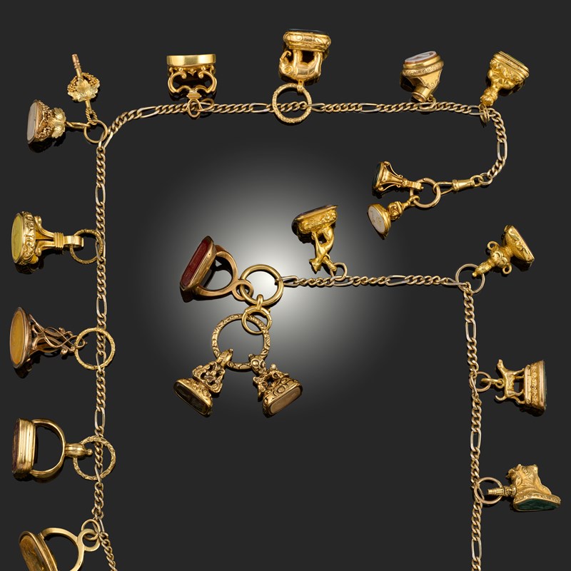 A COLLECTION OF GEORGIAN AND VICTORIAN GOLD SEALS, comprising a total of twenty pedestal seals and fob seals with hardstone, citrine and amethyst intaglio bases, suspended from Georgian gold split rings and Victorian connecting rings on a modern gilt metal chain, max. pendant height 4cm, chain length 74cm, gross weight 213.8g, some seals may contain metal element