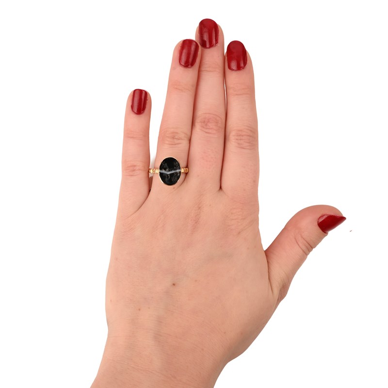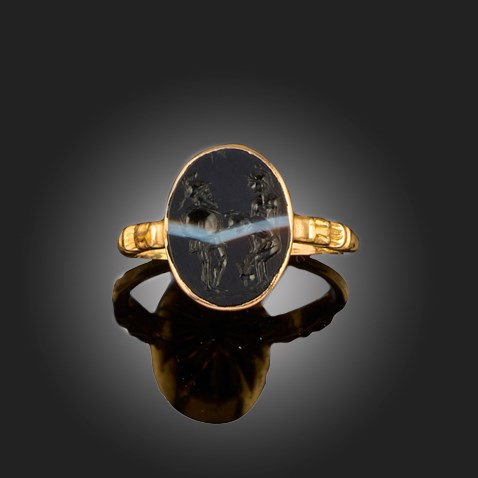 A GREEK BANDED AGATE INTAGLIO, 1ST CENTURY B.C., depicting three figures from the ‘Seven against Thebes’, length 1.5cm, later gold mount size O 1/2
