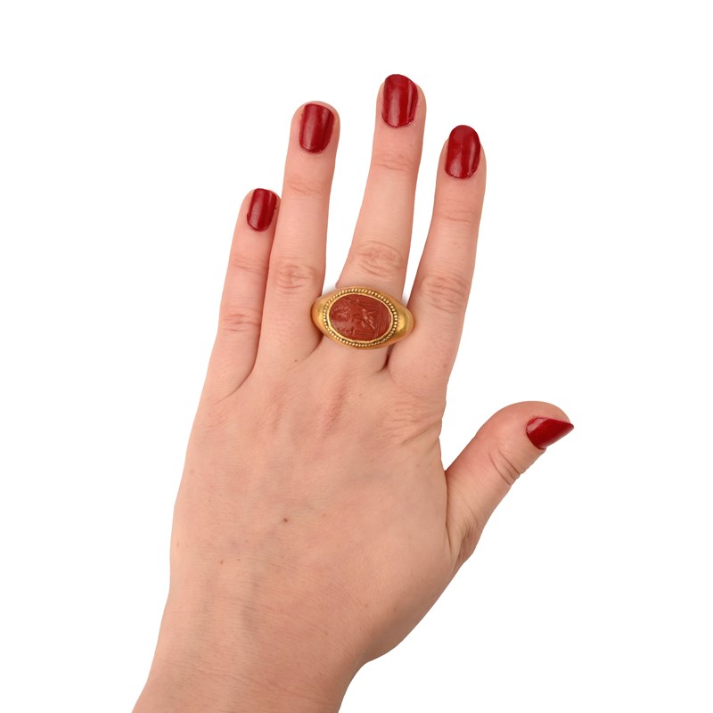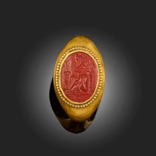 A ROMAN JASPER INTAGLIO, 2ND / 3RD CENTURY A.D., depicting four roman symbols, the head of Zeus, the eagle and two figures of Victoria on plinths, length 2cm, later gold mount, size J