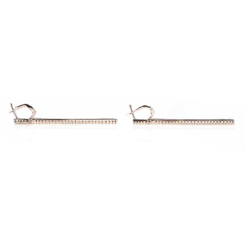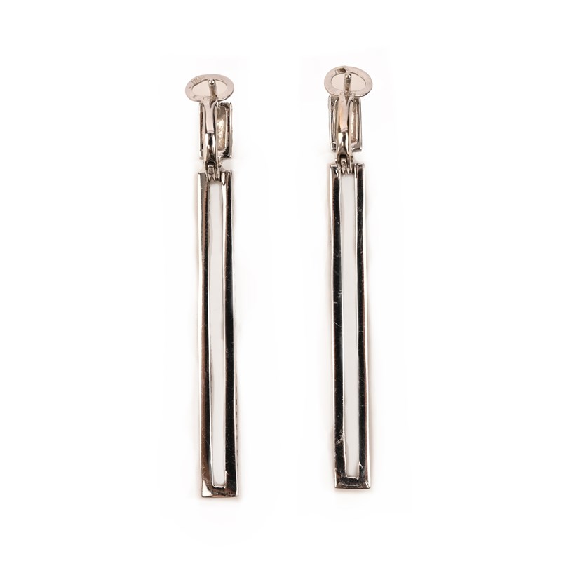 A PAIR OF DIAMOND DROP EARRINGS, the rectangular surmounts set with round brilliant-cut diamonds and suspending pierced rectangular drops with further diamonds in white gold, stamped 750, post and clip fittings, length 5cm