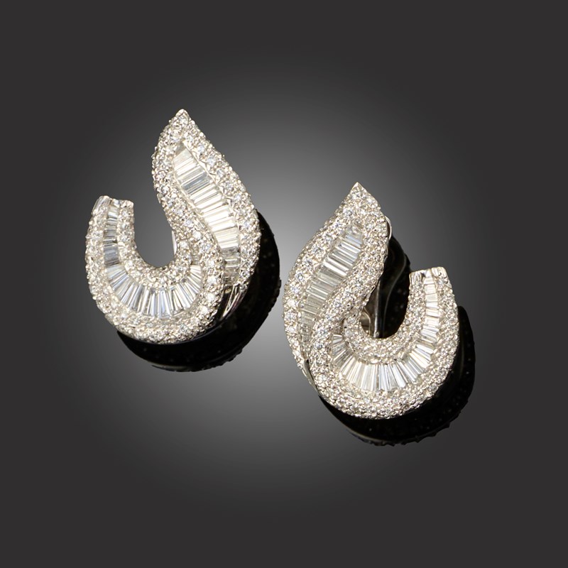 A PAIR OF DIAMOND SCROLL EARRINGS, set with baguette-shaped diamonds within borders of circular-cut diamonds in white gold, stamped K18, total approximate diamond weight 5.20ct, folding post and clip fittings, length 3cm