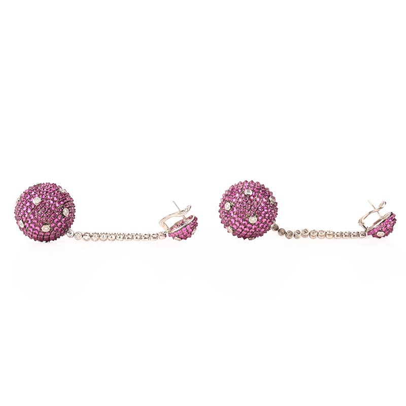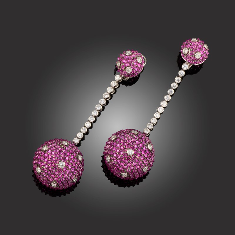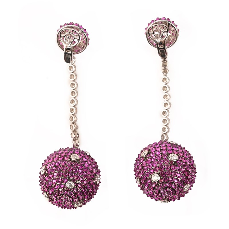 A PAIR OF PINK SAPPHIRE AND DIAMOND DROP EARRINGS, the lower sphere set with pink sapphires and diamond accents, suspended from an articulate line of round brilliant-cut diamonds beneath a hemi-sphere of pink sapphires and diamonds in white gold, marked S34.70 and D3.38, post and clip fittings, length 8cm
