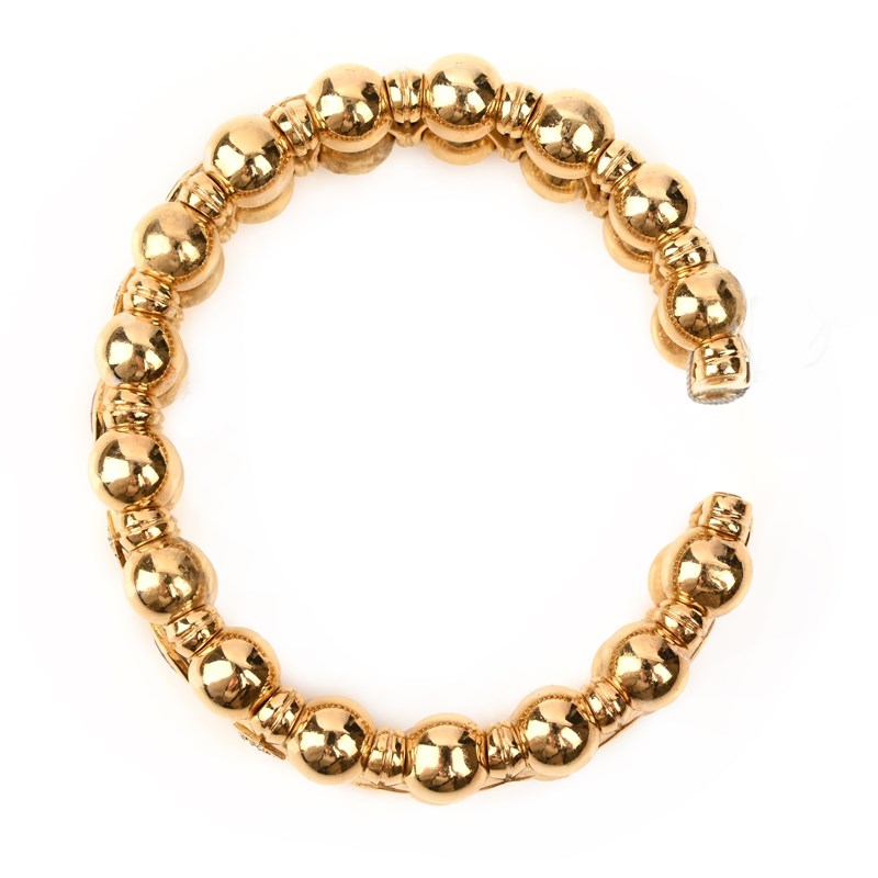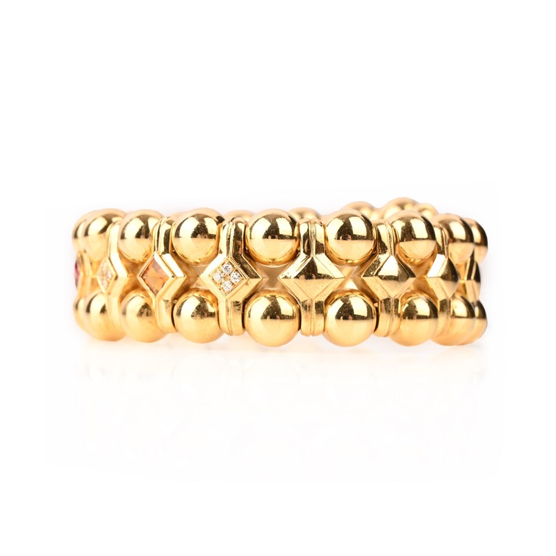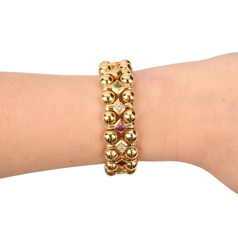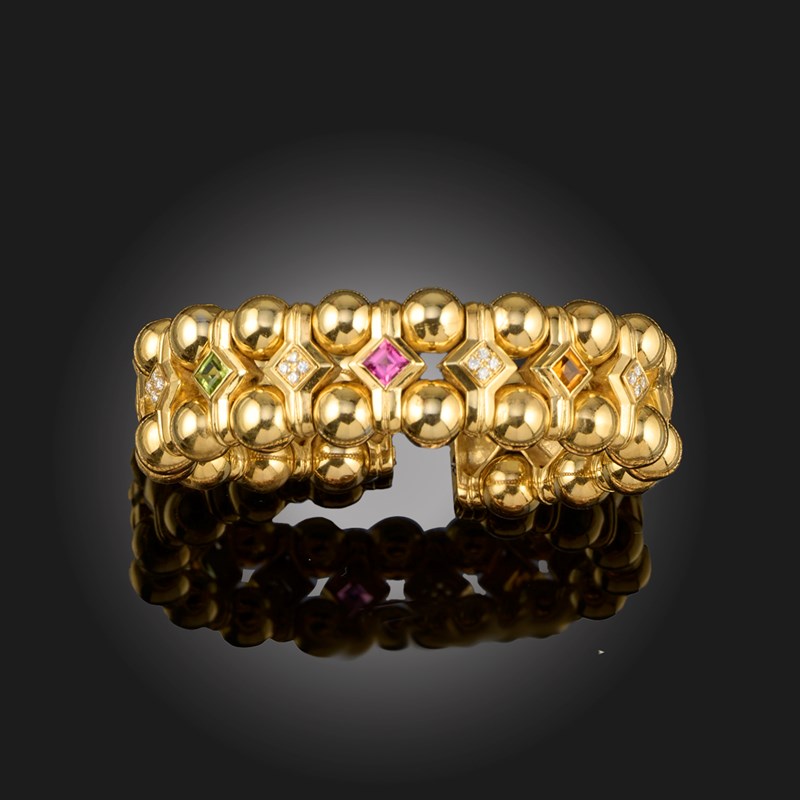 A MULTI-GEM-SET GOLD BANGLE, set with two rows of spherical links joined with links alternately-set with diamonds, citrine, tourmaline and peridot in yellow gold, inner circumference approx 15cm, 70g