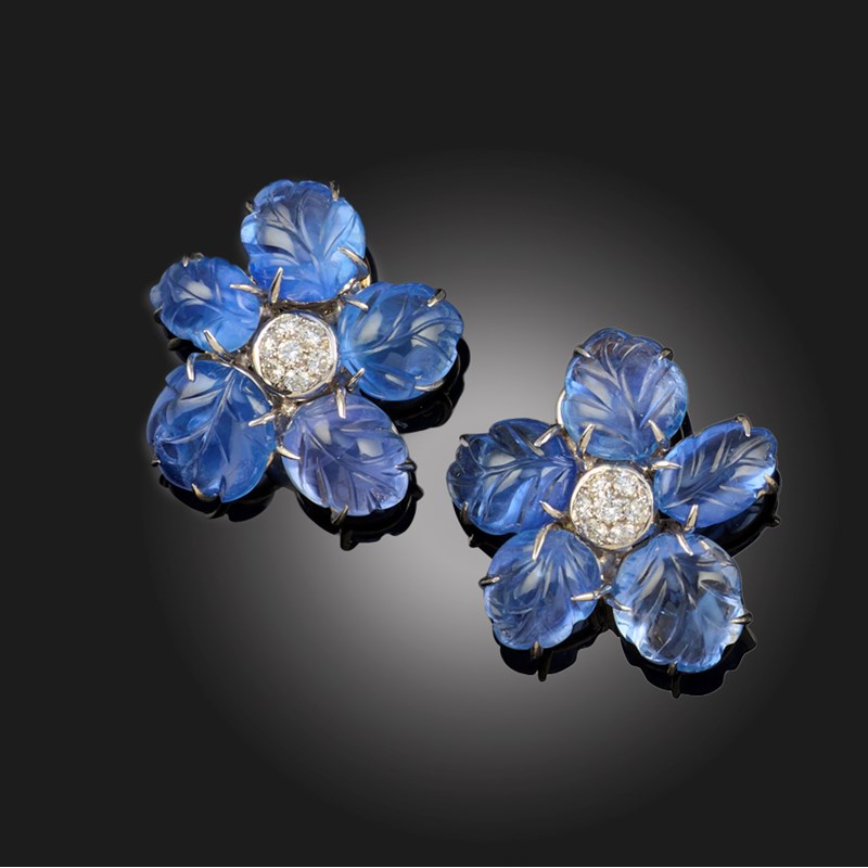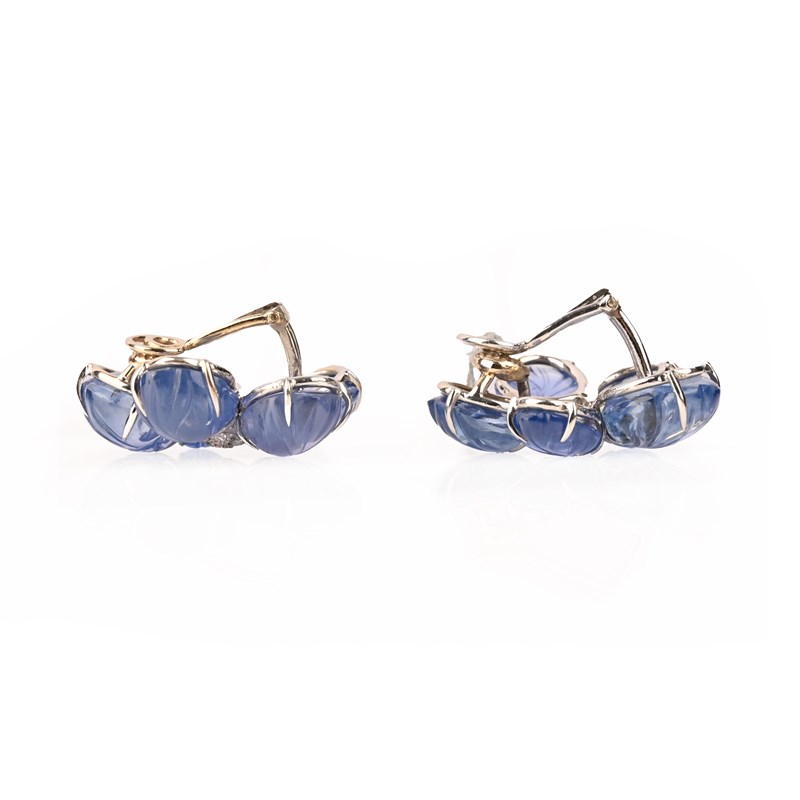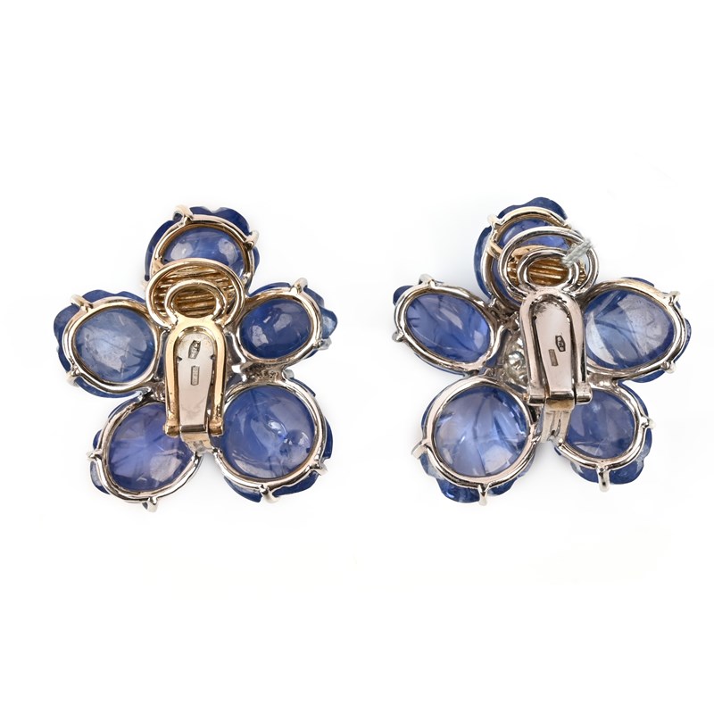A PAIR OF SAPPHIRE AND DIAMOND EARRINGS, designed as flowerheads, each set with a round brilliant-cut diamond cluster to the centre, within a border of carved sapphires in the form of petals, in white gold, stamped 750, with Italian control marks