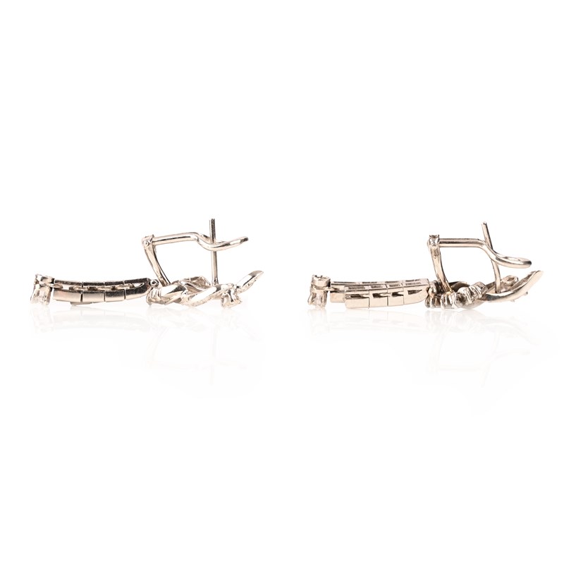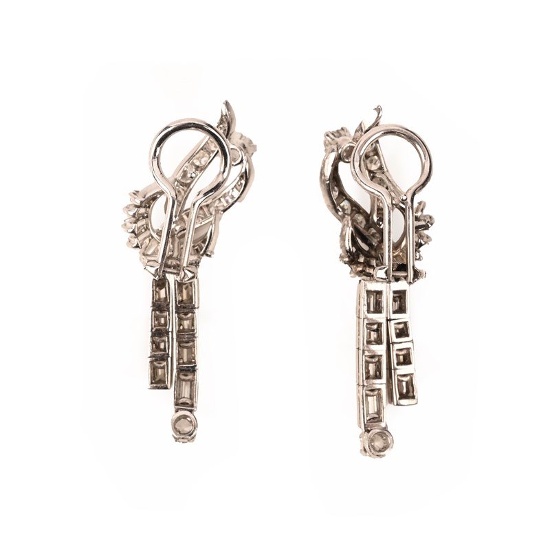 A PAIR OF DIAMOND DROP EARRINGS, of scroll design set with graduated single-cut diamonds surrounding a round brilliant-cut diamond, above baguette-shaped diamond scroll and articulated drops in white metal, white metal tests as low carat gold with silver and palladium, post and clip fittings, length 3.7cm