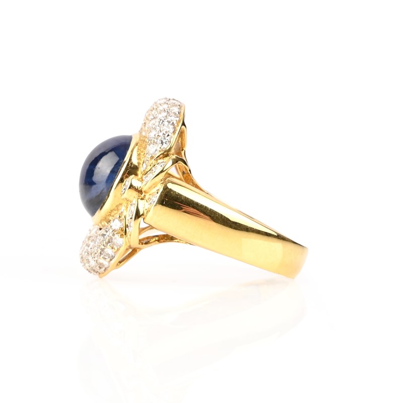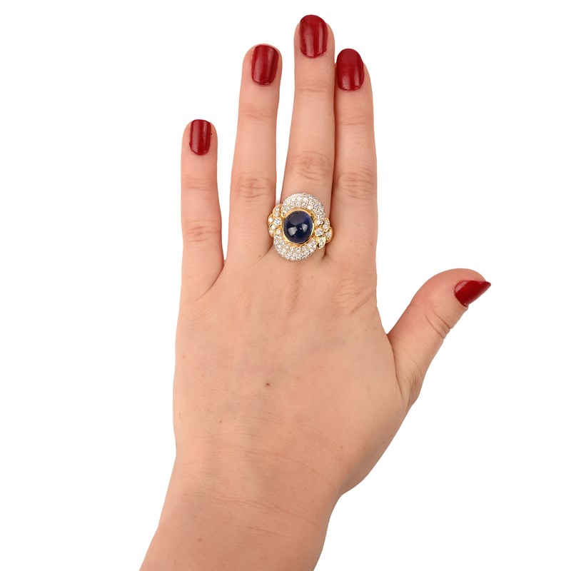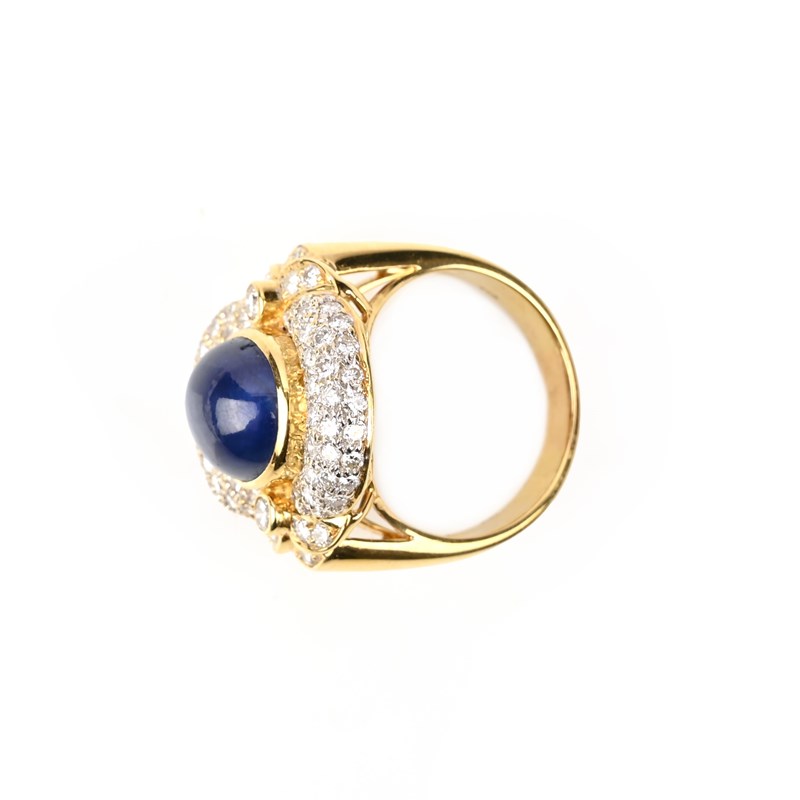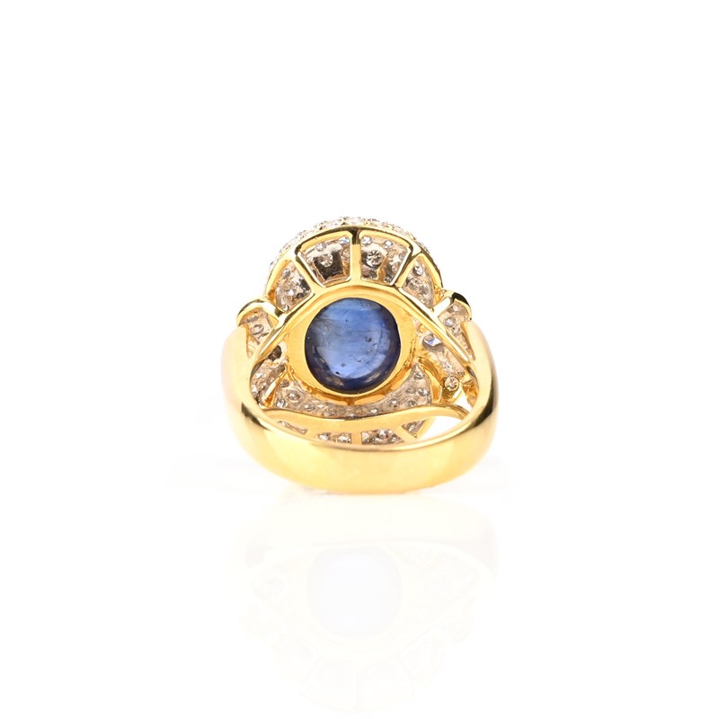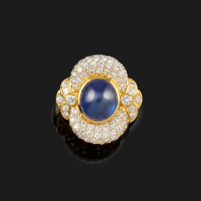 A SAPPHIRE AND DIAMOND DRESS RING, the central cabochon sapphire set within an oval surround pavé-set with round brilliant-cut diamonds in yellow gold, stamped 18k, size R