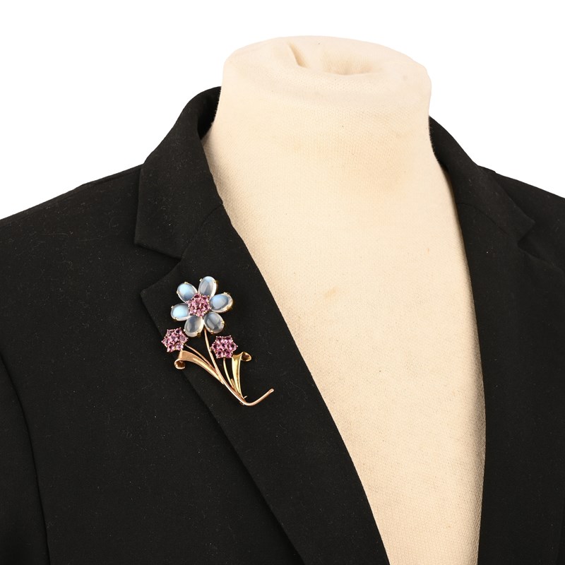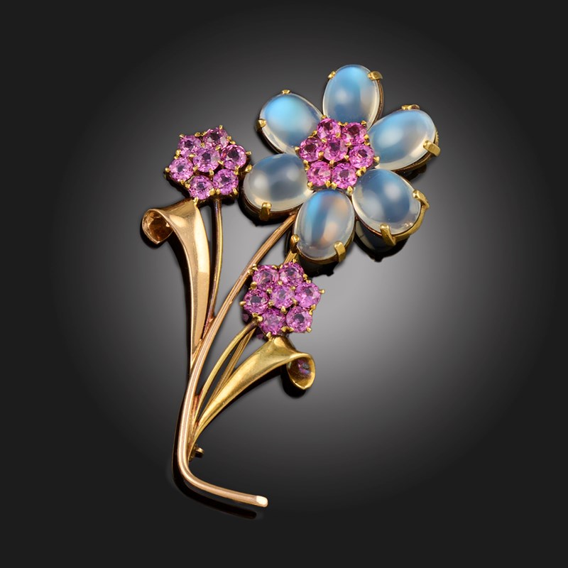 A MOONSTONE AND PINK TOURMALINE BROOCH, MID 20TH CENTURY