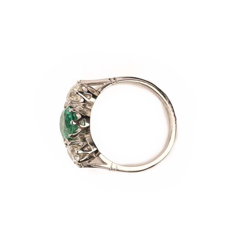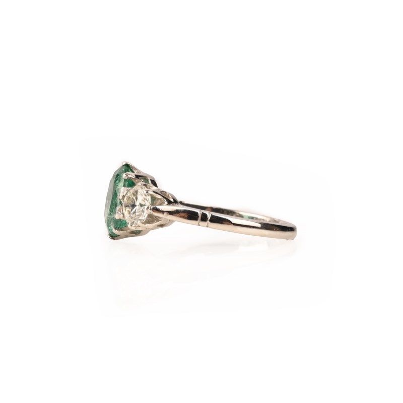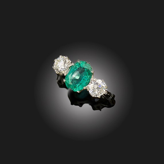 AN EMERALD AND DIAMOND THREE STONE RING