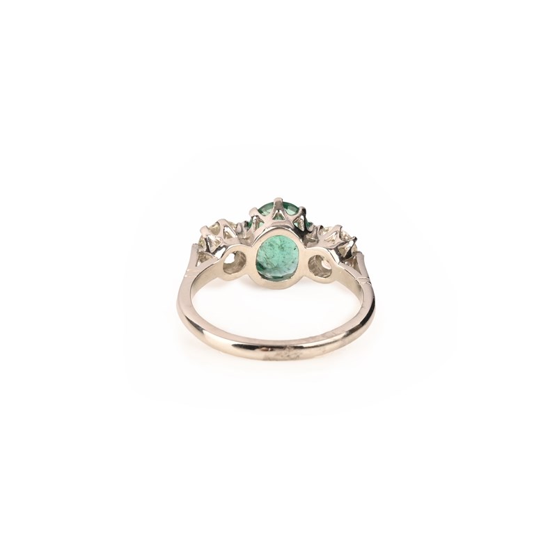 AN EMERALD AND DIAMOND THREE STONE RING, the oval-shaped emerald weighing approximately 1.05cts, flanked with round brilliant-cut diamonds in platinum, total diamond weight approximately 1.65cts, size N