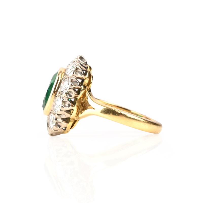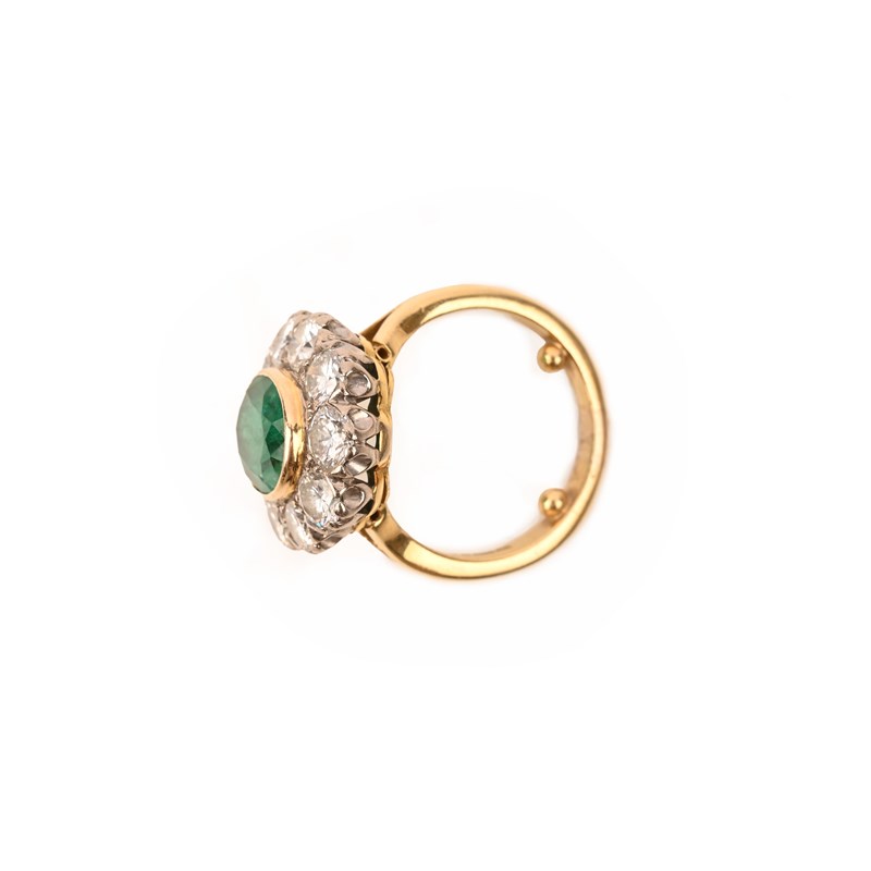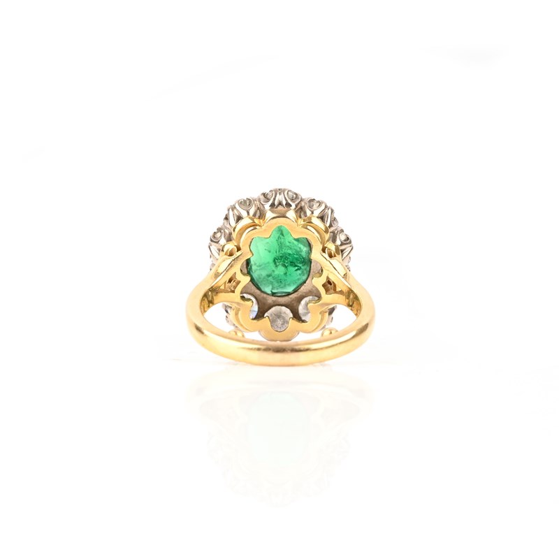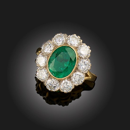 AN EMERALD AND DIAMOND CLUSTER RING, the oval emerald set within a surround of round brilliant-cut diamonds totalling approximately 3.00cts in platinum and 18ct yellow gold, inner re-sizing balls, London hallmarks, size N 1/2 approx