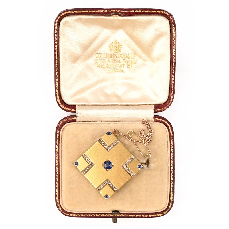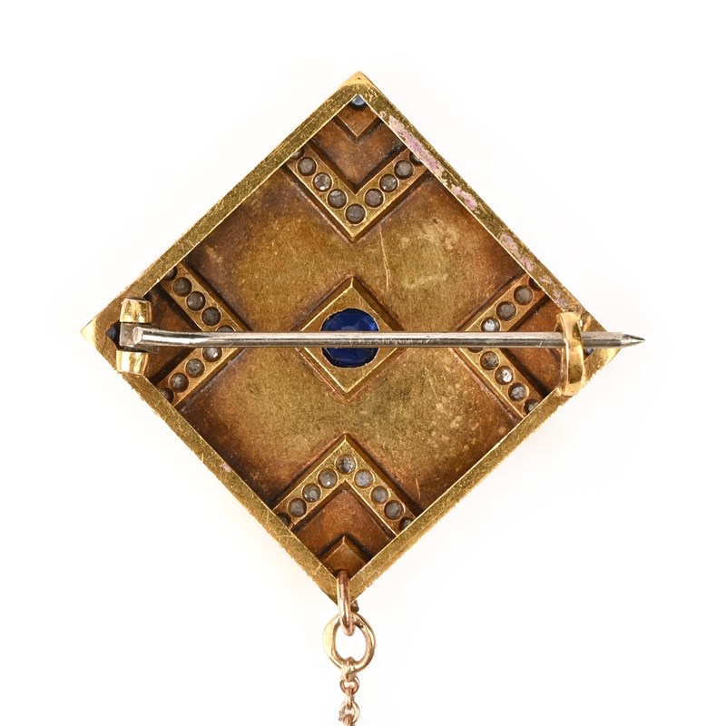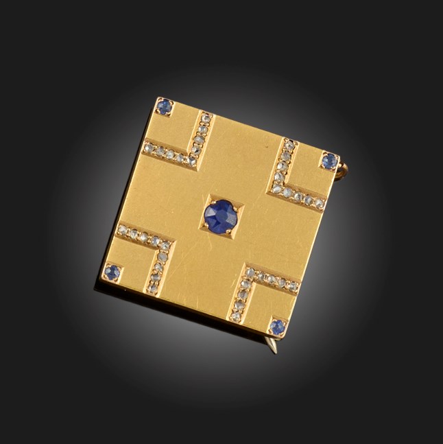 A SAPPHIRE, DIAMOND AND GOLD BROOCH, of lozenge design, centred with a circular-cut sapphire and quartered with smaller circular-cut sapphires within borders of rose-cut diamonds, width 3.2cm, gross weight 6.3g, indistinct French marks, case