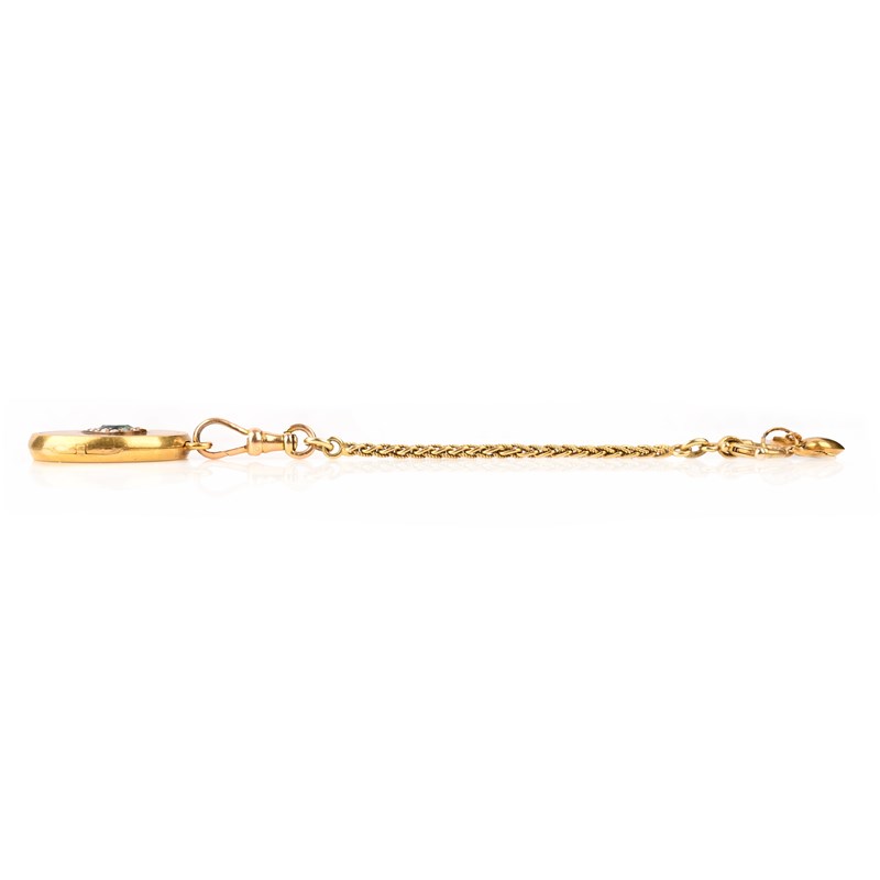 A LATE 19TH CENTURY GOLD LOCKET, decorated with a heart set with a pear-shaped emerald within a border of rose-cut diamonds, opening to reveal a lock of hair, on a loop-in-loop chain, inscribed Glaube, Liebe, Hoffnung and den 24ten. Juli 1863, partial Austrian maker’s and assay marks, locket width 2.5cm, chain length 10cm