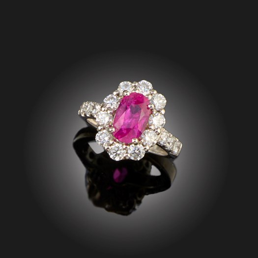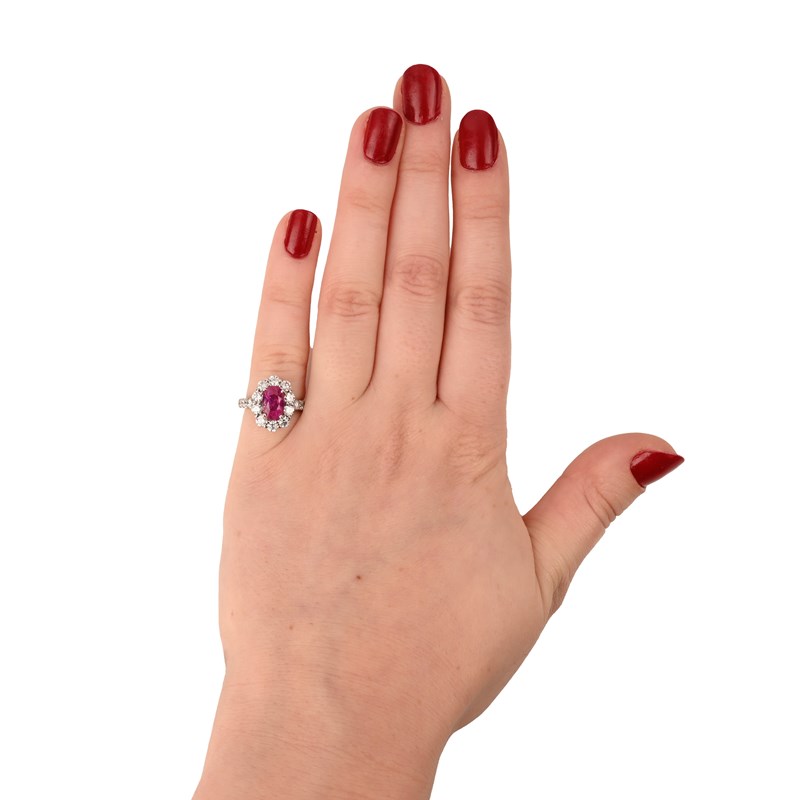 A RUBY AND DIAMOND CLUSTER RING, the oval-shaped ruby weighing 2.11cts set within a surround of round brilliant-cut diamonds and diamond shoulders in white gold, stamped 18k, size H 1/2