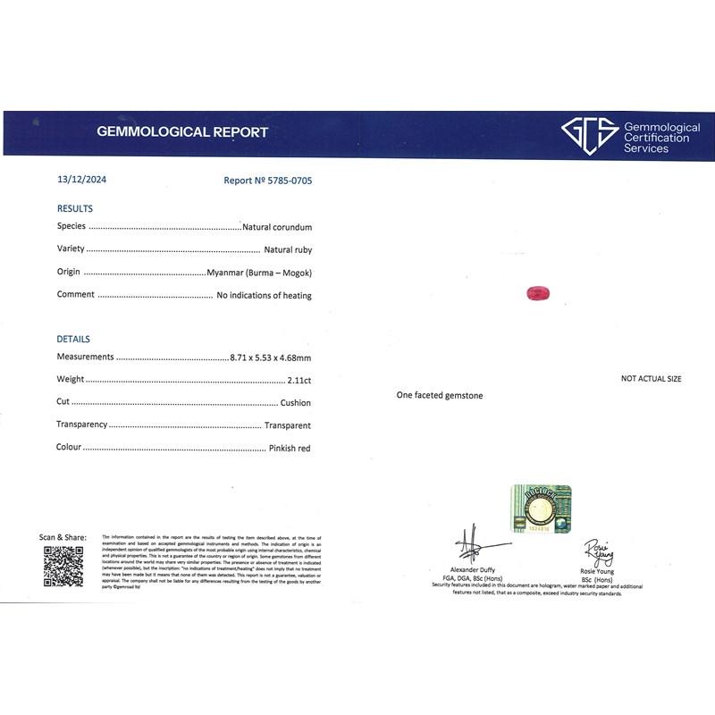 Accompanied by report number 5785-0705 dated 13th December 2024 from GCS stating that the ruby shows no indications of heating, origin: Burma