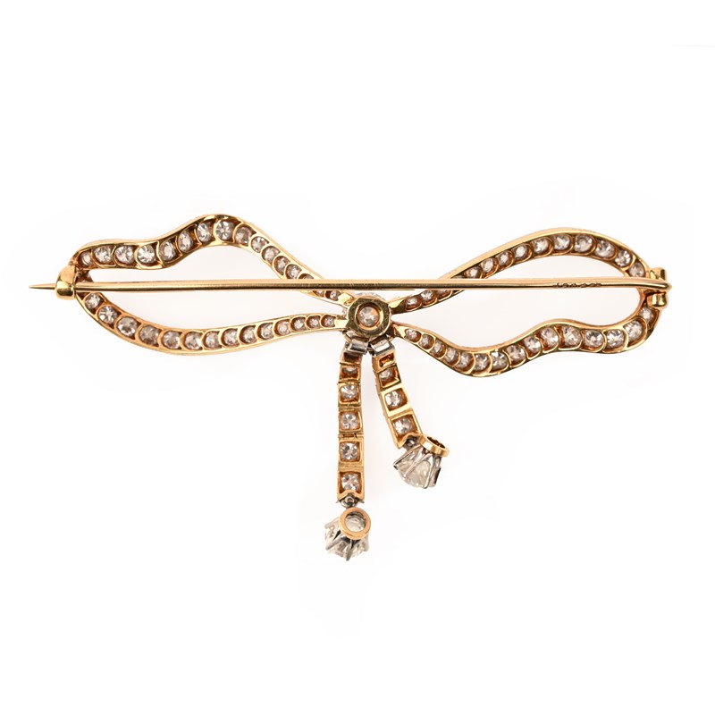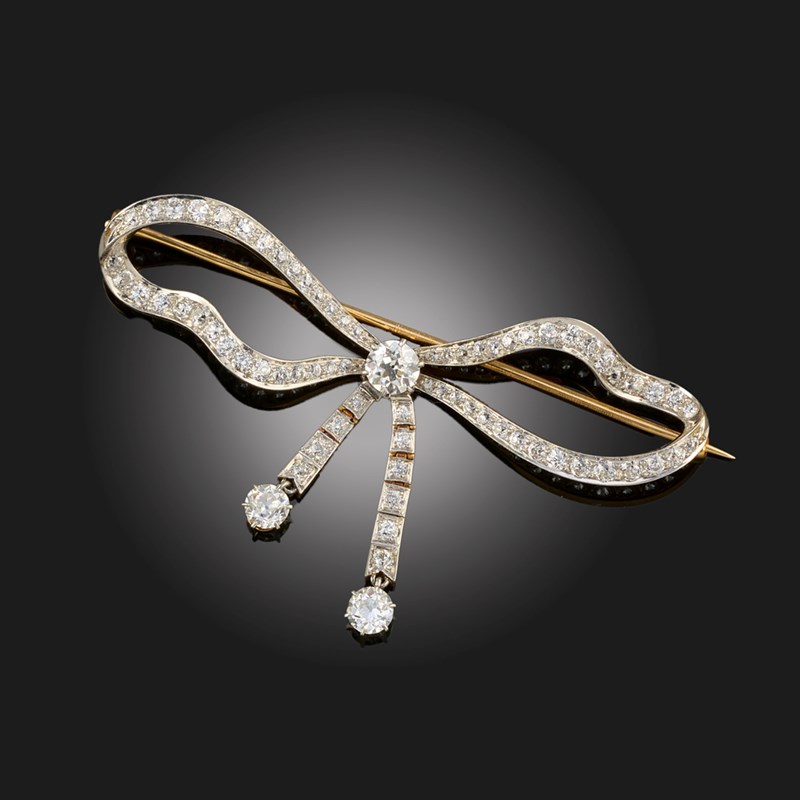 J.E.CALDWELL & CO, A DIAMOND-SET BOW BROOCH, EARLY 20TH CENTURY, of stylised design set with graduated old circular-cut diamonds, centring on a larger diamond and suspending two articulated diamond drops in platinum and gold, signed and numbered D6582, width 7.5cm