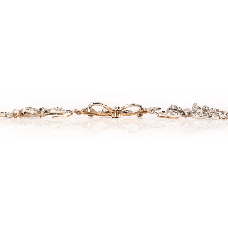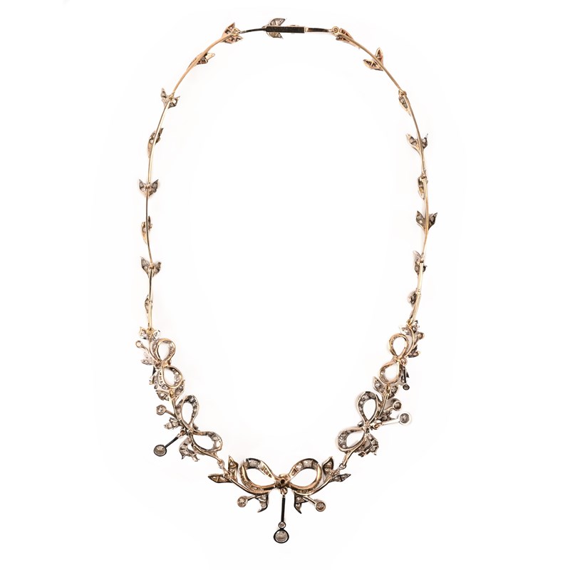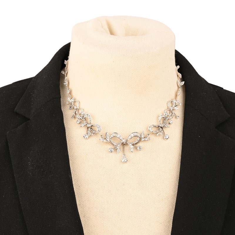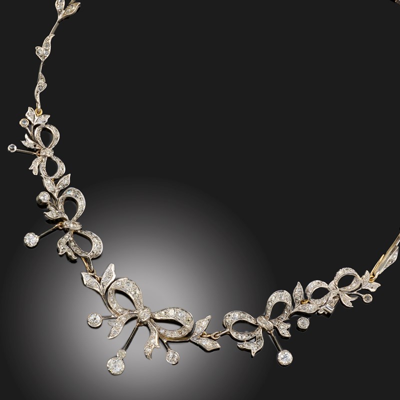 A DIAMOND NECKLACE, designed as a row of diamond-set vine leaves centring on a row of graduating stylised diamond-set bow motifs, suspending diamond-set articulated drops, in white gold, the necklace detaches into five sections and the principal bow has brooch fittings to the reverse, also with a brooch pin, length as a necklace 40cm, brooch width 5cm