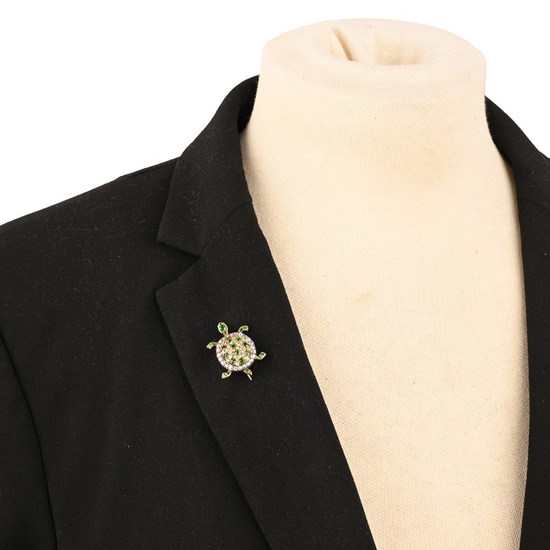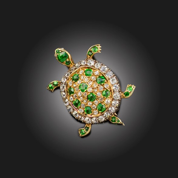 A DIAMOND AND DEMANTOID GARNET BROOCH, modelled as a turtle, set in silver and gold, length 2.5cm