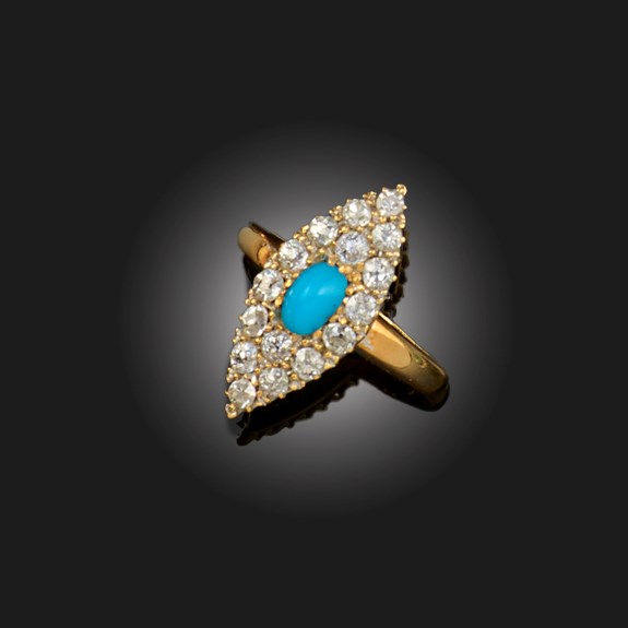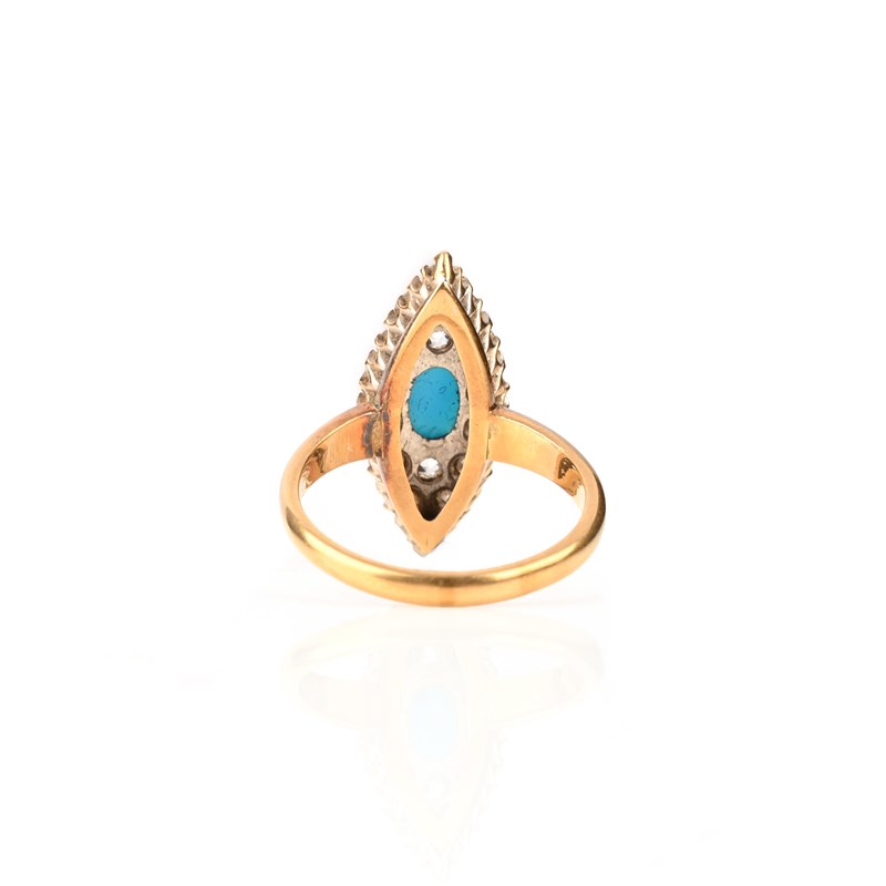 AN EARLY 20TH CENTURY TURQUOISE AND DIAMOND RING, of navette-shaped design, set with a cabochon turquoise to the centre within a surround of pavé-set old-cut diamonds, in 18ct yellow gold, with maker's mark and British hallmarks, partially worn, size M