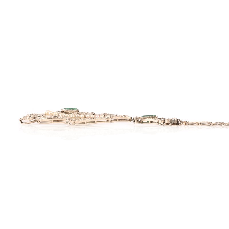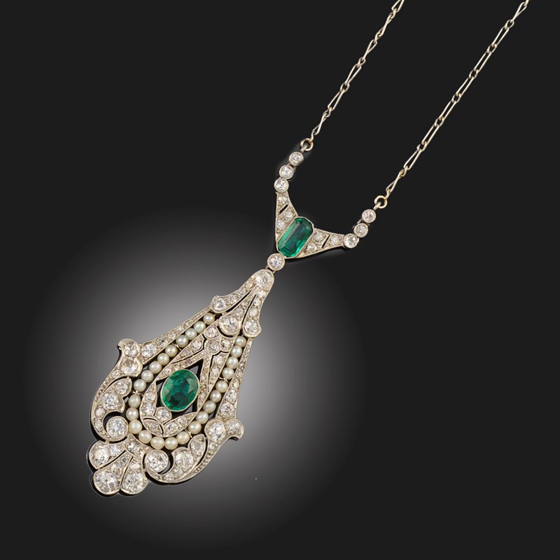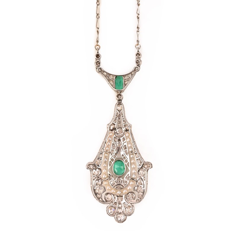 AN EDWARDIAN EMERALD, DIAMOND AND SEED-PEARL PENDANT NECKLACE