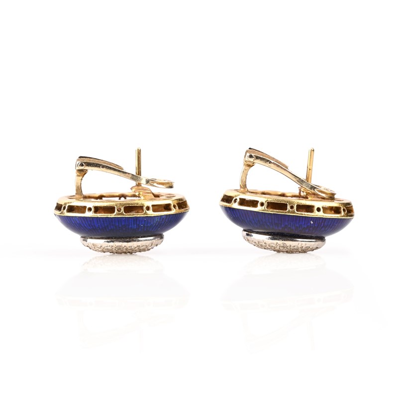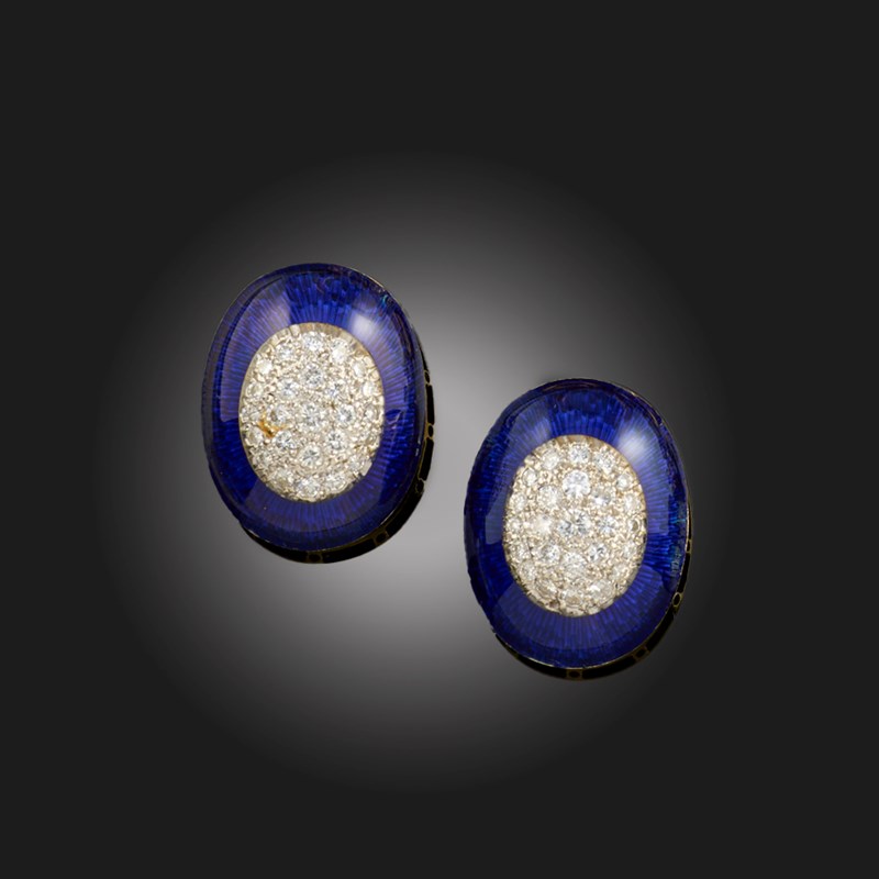 A PAIR OF BLUE ENAMEL AND DIAMOND CLUSTER EARRINGS