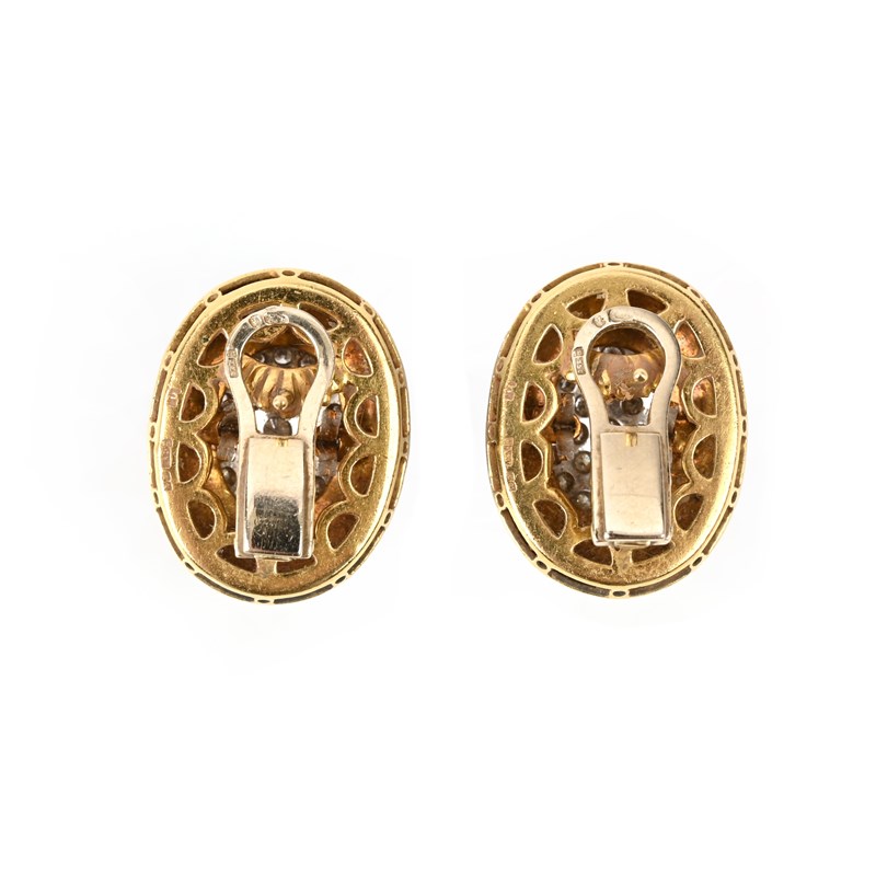 A PAIR OF BLUE ENAMEL AND DIAMOND CLUSTER EARRINGS, of oval design centring on a cluster of round brilliant-cut diamonds within blue guilloché enamel border in 18ct gold, post and clip fittings, length 2.2cm