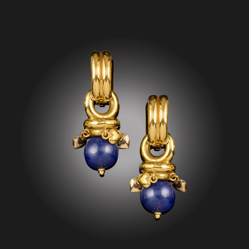 A PAIR OF LAPIS LAZULI AND GOLD DROP EARRINGS