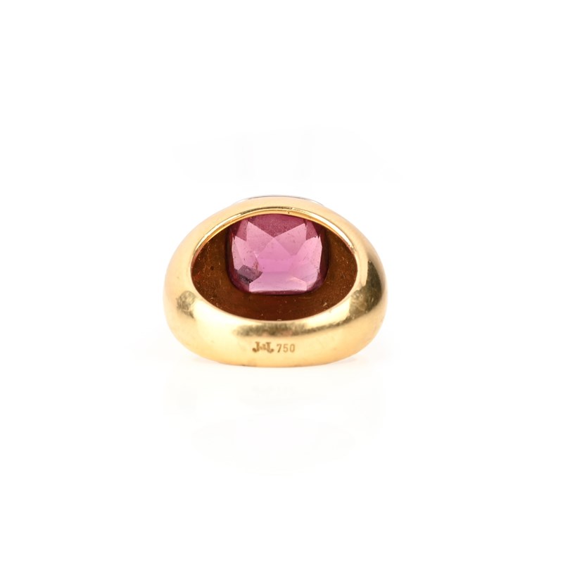 A GARNET SOLITAIRE RING, the cushion-shaped garnet in polished yellow gold setting, maker's mark JL and stamped 750, size L, 14.5g