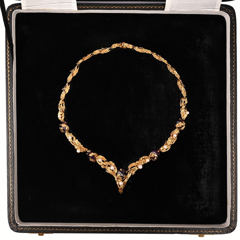 GROSSE, AN AMETHYST, CULTURED PEARL AND 18CT GOLD NECKLACE, C1965, of wishbone design composed of textured 18ct gold scrolling links set with faceted amethyst crystals and cultured pearls, signed Grosse, Germany 65, London import marks for 1967, length 42cm, gross weight 56.1g, case