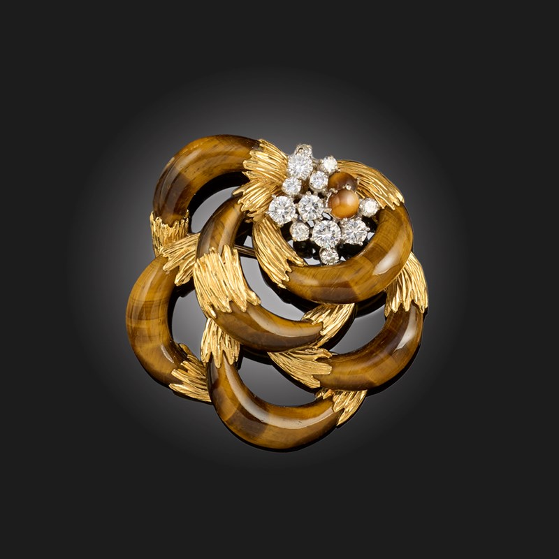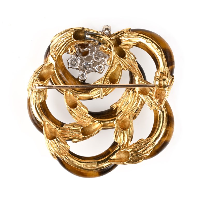 KUTCHINSKY, A DIAMOND, TIGER'S EYE AND 18CT GOLD BROOCH, C1971, designed as interlocking hoops of tiger's eye with textured 18ct gold mounts, centring on a cluster of round brilliant-cut diamonds and circular tiger's eye cabochons, signed Kutchinsky, London hallmarks for 1971, width 5cm, gross weight 38g