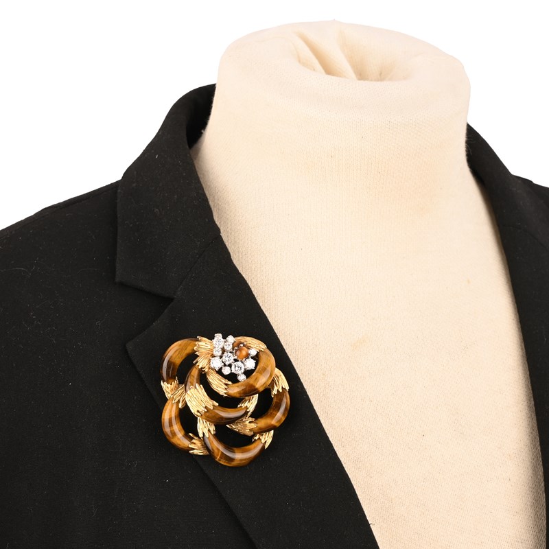 KUTCHINSKY, A DIAMOND, TIGER'S EYE AND 18CT GOLD BROOCH, C1971
