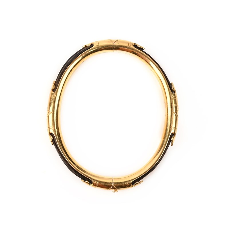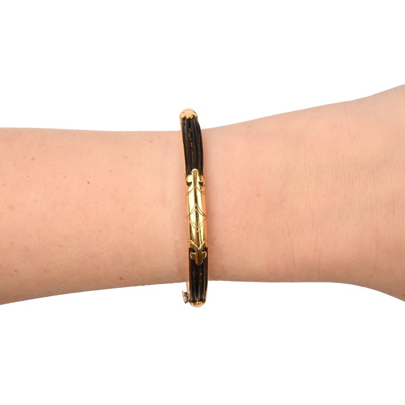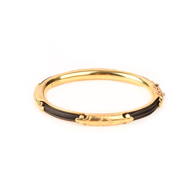 λ CARTIER, A GOLD-MOUNTED HINGED BANGLE, C1974, composed of rows of elephant's hair within engraved 18ct yellow gold mounts, signed Cartier London, maker's mark JC, London hallmarks for 1974, inner circumference approximately 16cm