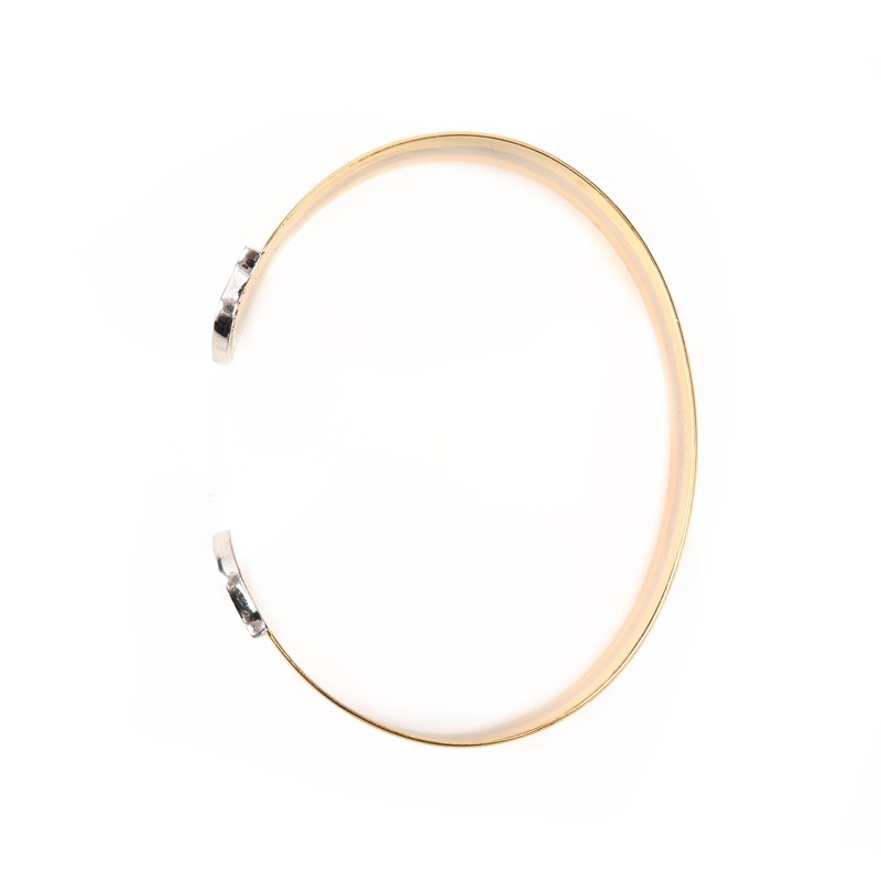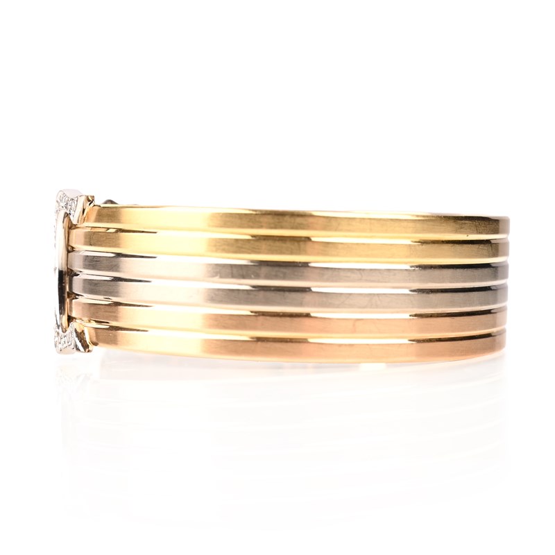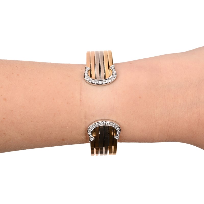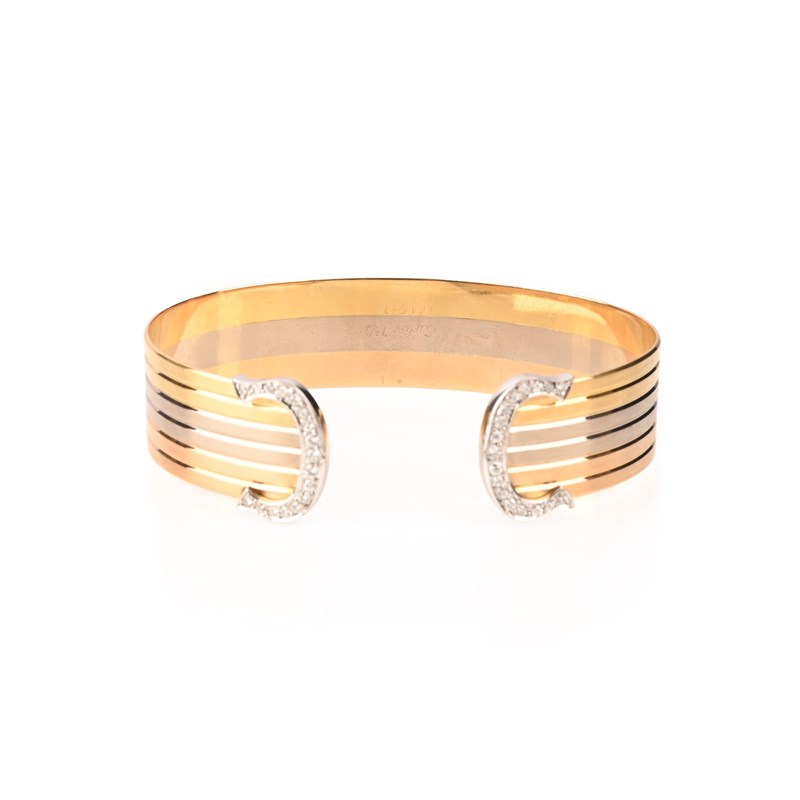 CARTIER, A 'C DE CARTIER' DIAMOND-SET CUFF BANGLE, the 'C' motifs set with round brilliant-cut diamonds, to the terminals of the tri-colour gold bangle, signed Cartier, stamped 750, with Swiss control marks, numbered 761597, inner circumference approximately 19cm