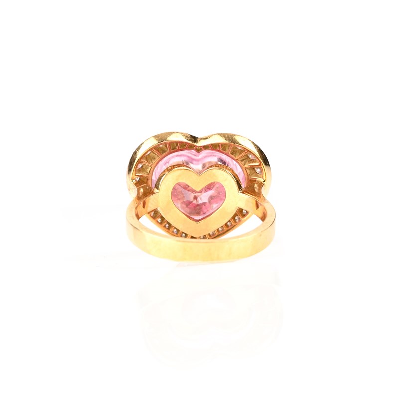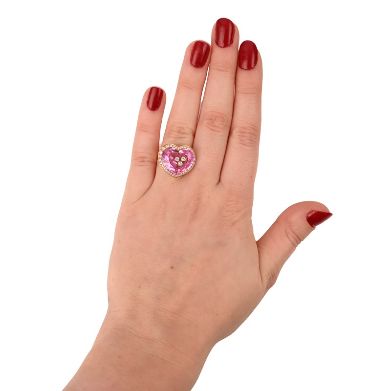 CHOPARD, A HAPPY DIAMONDS PINK QUARTZ AND DIAMOND RING, the faceted pink quartz heart with a cavity with three free-moving circular-cut diamonds in gold collets, all within a surround of smaller diamonds in yellow gold, signed and numbered 82/6121/05-20 3051730, stamped 750, total approximate diamond weight 0.50cts, size M 1/2