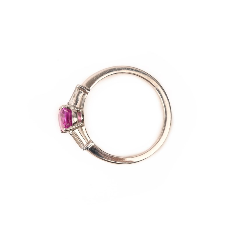 BULGARI, A PINK SAPPHIRE AND DIAMOND RING, the cushion-cut pink sapphire weighing approximately 1.25cts, between tapered baguette-cut diamond-set shoulders, in platinum, signed Bulgari, maker's lozenge PP, with Italian control marks and stamped Made in Italy, size P 1/2