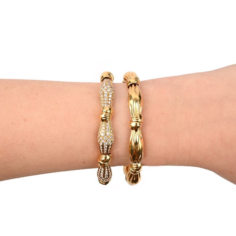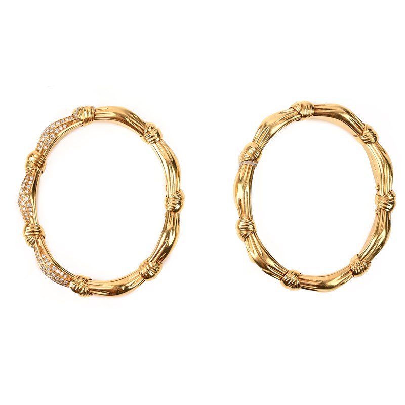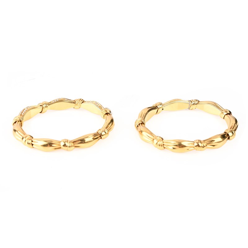 ASPREY, A PAIR OF GOLD BANGLES, C1996, designed as tapering ribbon and accented with gold bands, one bangle with three diamond-set panels, both signed Asprey with maker's mark and London hallmarks for 1996, internal circumference 16.5cm, total gross weight 100g