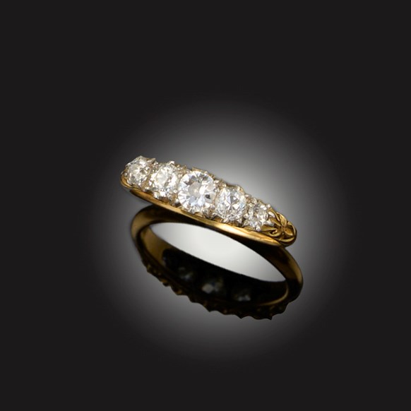 A DIAMOND FIVE STONE RING, set with graduated old circular-cut diamonds in carved and pierced yellow gold setting, size R