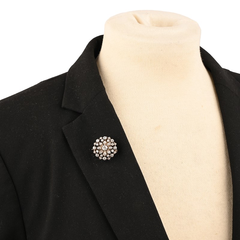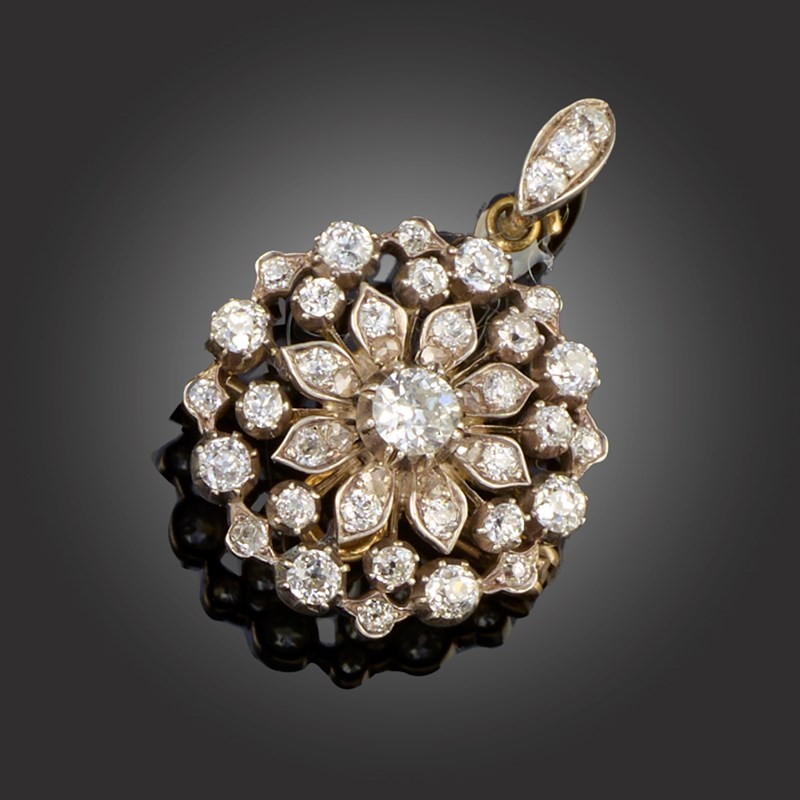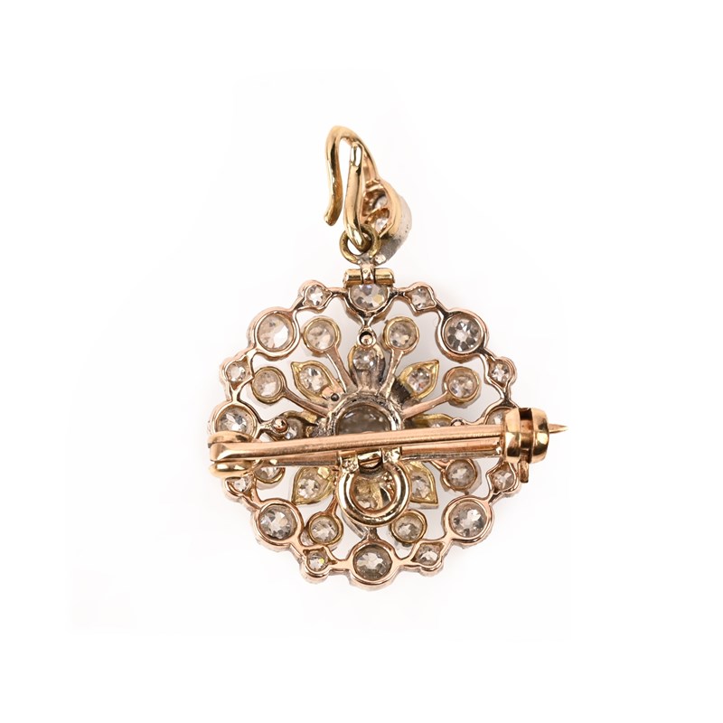 A LATE 19TH CENTURY DIAMOND BROOCH / PENDANT, formed as a flower head, set with old circular-cut diamonds, in yellow gold, folding pendant loop and detachable brooch fitting, diameter 2.3cm