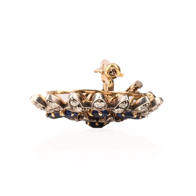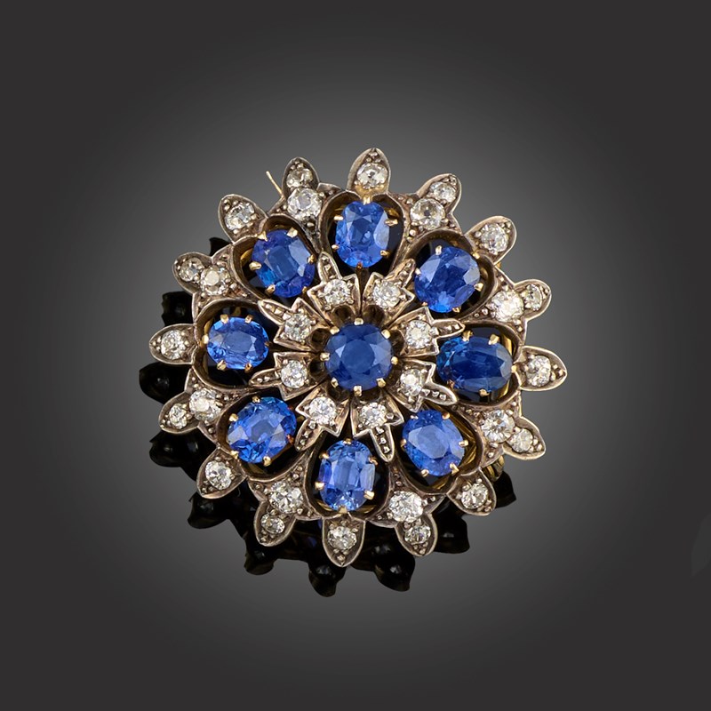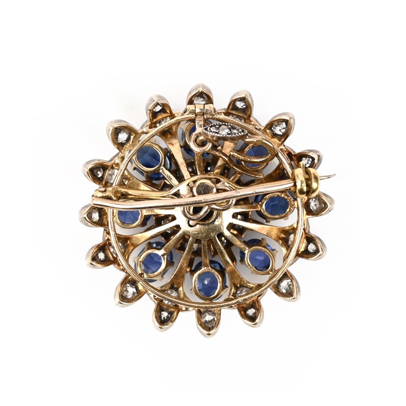 A LATE 19TH CENTURY SAPPHIRE AND DIAMOND BROOCH, set with oval sapphires and graduated old-cut diamonds in pierced circular, stylised floral surround, all set in silver and gold, detachable brooch fitting and folding pendant loop, width 3.2cm