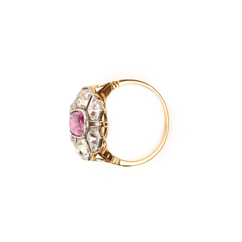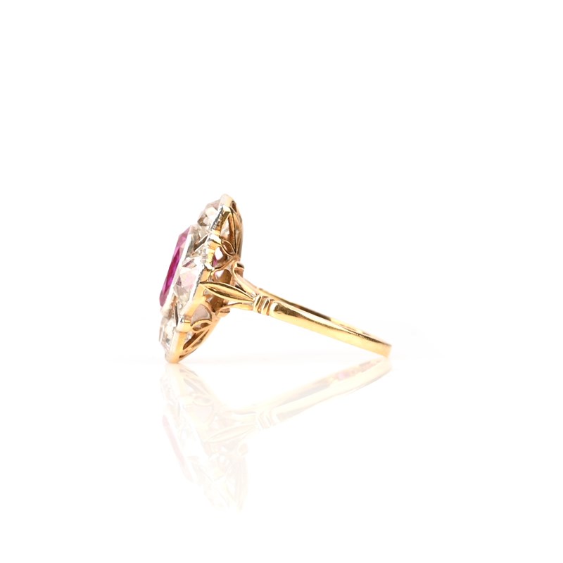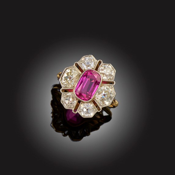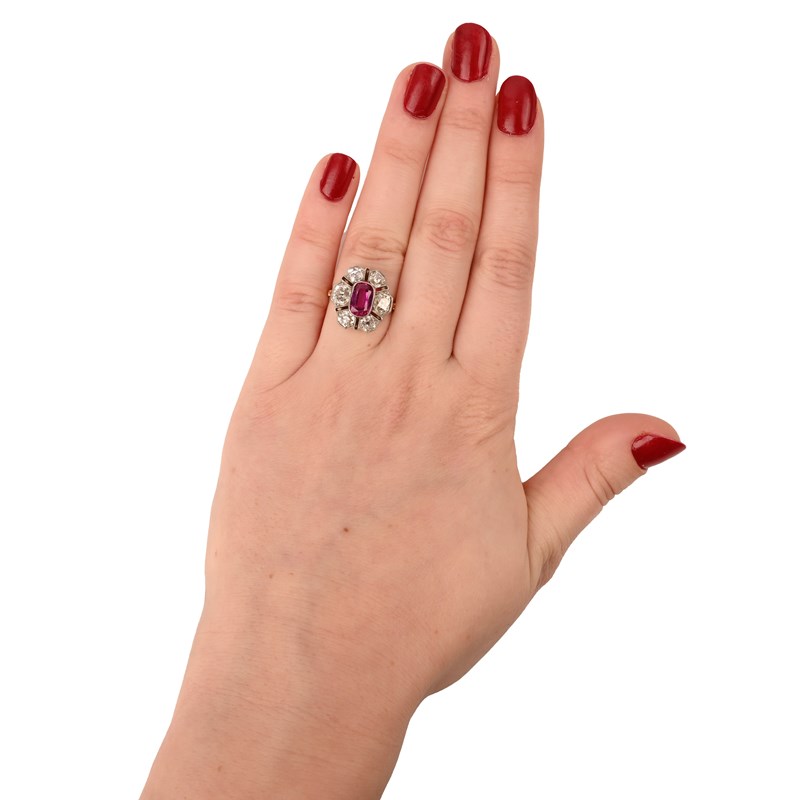 A RUBY AND DIAMOND CLUSTER RING, set with a cushion-shaped ruby weighing approximately 2.20cts, within a border of six cushion-shaped diamonds, mounted in platinum and gold, size K